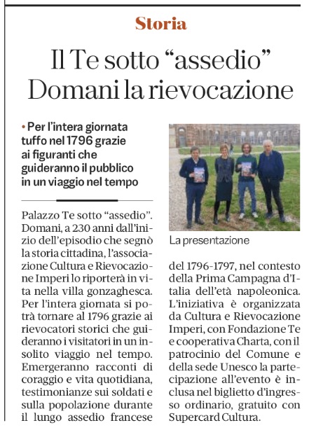 Palazzo Te sotto “assedio”. Domani, a 230 anni dall’inizio dell’episodio che segnò la storia cittadina, l’associazione Cultura e Rievocazione Imperi lo riporterà in vita nella villa gonzaghesca. Per l’intera giornata si potrà tornare al 1796 grazie ai rievocatori storici che guideranno i visitatori in un insolito viaggio nel tempo. Emergeranno racconti di coraggio e vita quotidiana, testimonianze sui soldati e sulla popolazione durante il lungo assedio francese del 1796-1797, nel contesto della Prima Campagna d’Italia dell’età napoleonica. L’iniziativa è organizzata da Cultura e Rievocazione Imperi, con Fondazione Te e cooperativa Charta, con il patrocinio del Comune e della sede Unesco la partecipazione all’evento è inclusa nel biglietto d’ingresso ordinario, gratuito con Supercard Cultura.