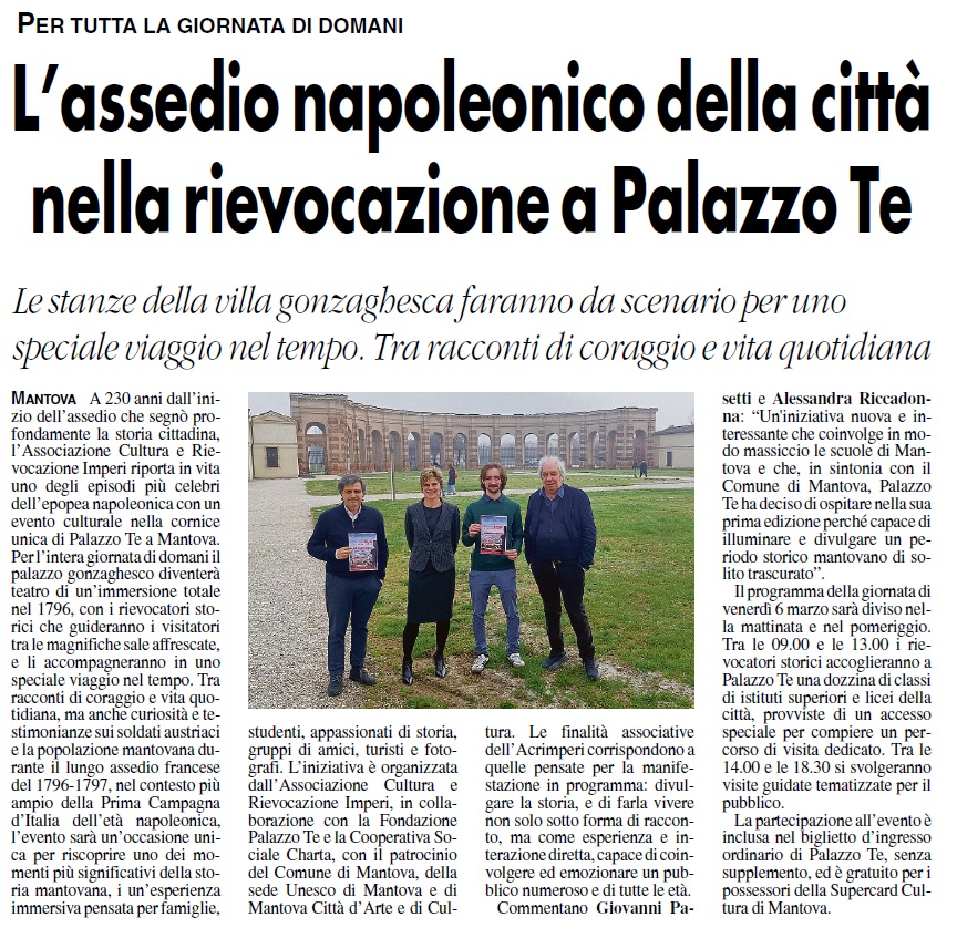 A 230 anni dall’inizio dell’assedio che segnò profondamente la storia cittadina, l’Associazione Cultura e Rievocazione Imperi riporta in vita uno degli episodi più celebri dell’epopea napoleonica con un evento culturale nella cornice unica di Palazzo Te a Mantova.