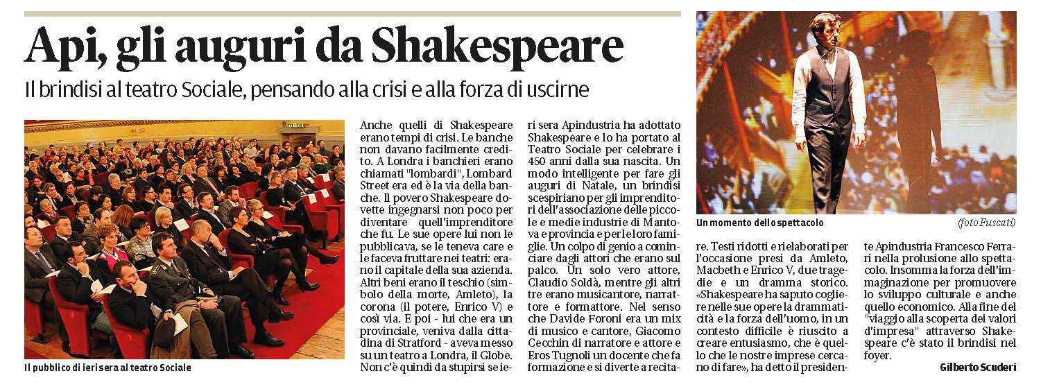 Anche quelli di Shakespeare erano tempi di crisi. Le banche non davano facilmente credito. A Londra i banchieri erano chiamati “lombardi”, Lombard Street era ed è la via della banche. Il povero Shakespeare dovette ingegnarsi non poco per diventare quell’imprenditore che fu. Le sue opere lui non le pubblicava, se le teneva care e le faceva fruttare nei teatri: erano il capitale della sua azienda. Altri beni erano il teschio (simbolo della morte, Amleto), la corona (il potere, Enrico V) e così via. E poi – lui che era un provinciale, veniva dalla cittadina di Stratford – aveva messo su un teatro a Londra, il Globe. Non c’è quindi da stupirsi se ieri sera Apindustria ha adottato Shakespeare e lo ha portato al Teatro Sociale per celebrare i 450 anni dalla sua nascita. Un modo intelligente per fare gli auguri di Natale, un brindisi scespiriano per gli imprenditori dell’associazione delle piccole e medie industrie di Mantova e provincia e per le loro famiglie. Un colpo di genio a cominciare dagli attori che erano sul palco. Un solo vero attore, Claudio Soldà, mentre gli altri tre erano musicantore, narrattore e formattore. Nel senso che Davide Foroni era un mix di musico e cantore, Giacomo Cecchin di narratore e attore e Eros Tugnoli un docente che fa formazione e si diverte a recitare. Testi ridotti e rielaborati per l’occasione presi da Amleto, Macbeth e Enrico V, due tragedie e un dramma storico. «Shakespeare ha saputo cogliere nelle sue opere la drammaticità e la forza dell’uomo, in un contesto difficile è riuscito a creare entusiasmo, che è quello che le nostre imprese cercano di fare», ha detto il presidente Apindustria Francesco Ferrari nella prolusione allo spettacolo. Insomma la forza dell’immaginazione per promuovere lo sviluppo culturale e anche quello economico. Alla fine del “viaggio alla scoperta dei valori d’impresa” attraverso Shakespeare c’è stato il brindisi nel foyer. Gilberto Scuderi