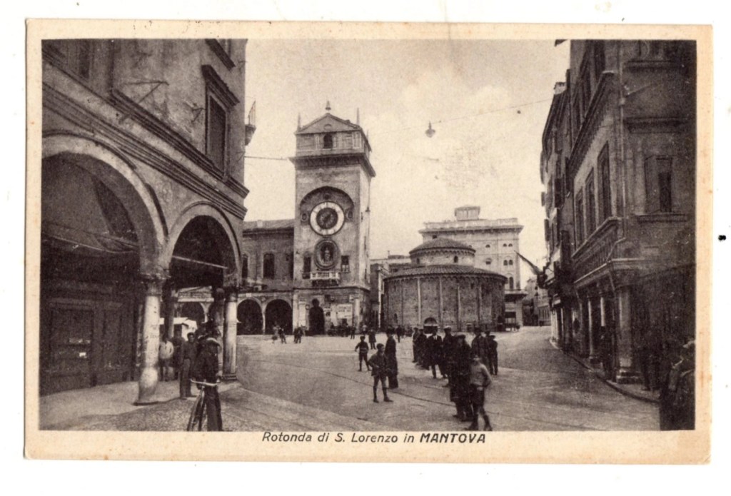 1906 – e’ l’anno in cui il comune di Mantova autorizza la costruzione di una strada che colleghi piazza Erbe a Porto Catena. Per questo si iniziano a demolire le case che chiudevano la piazza del mercato collegando la Torre dell’Orologio alle case sull’altro lato. E’ ancora oggi impressionante vedere le foto senza la Rotonda con l’insegna di un macellaio e una piccola croce in alto sopra le case (forse ancora quella che si vede oggi sulla piccola lanterna della chiesa). Durante le demolizioni si vedono le fondazioni, i muri e le colonne della Rotonda e si decide di ricostruirla prendendo a modello quella di Almenno San Bartolomeo in provincia di Bergamo. Nel 1911 i lavori sono praticamente completati ma sta arrivando la prima guerra mondiale e tutto si blocca.