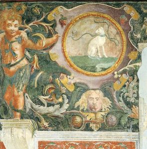Gli affreschi di Palazzo Te sono pieni di animali che escono dalle pareti, occhieggiano dai soffitti o giocano a nascondino sui camini. Ce ne sono di tutti i tipi e, se dimentichiamo per un attimo i famosi cavalli dei Gonzaga, è possibile organizzare una sorta di caccia incruenta per individuarli. In particolare se ci limitassimo agli animali che affollano gli stemmi e le imprese dei Gonzaga ce ne sono almeno 5 da osservare: