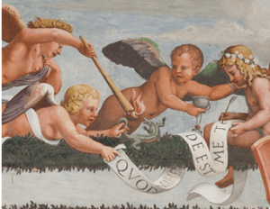 IL CANE – Entrati nella camera delle imprese giriamo la testa a sinistra e là in alto nel fregio c’è il famoso cane retrospiciente. Simbolo di fedeltà questo cane è di solito inserito in un contesto dove sono riportati i colori araldici dei Gonzaga: il bianco (di regola il colore del cane), il rosso (lo sfondo) e il verde (il prato dove sta seduto