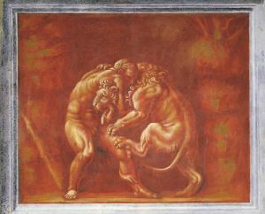 i leoni sono due e li ritroviamo nello stemma nel fregio della camera delle imprese. Ma leoni ce ne sono anche in versione non araldica come quello che affronta Ercole nei finti bassorilievi bronzei della sala dei cavalli, o quello della loggia di Davide o quelli che si ritrovano in alto nel camarone dei Giganti insieme alle divinità del monte Olimpo.