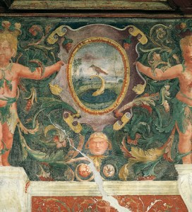 IL RAMARRO – L’impresa più famosa di Palazzo Te è il Ramarro con il motto latino (quod huic deest me torquet) a sottolineare che quello che manca al rettile tormenta il marchese Federico II (in particolar modo il sangue caldo). Il ramarro sbuca un po’ da tutte le parti: sui camini e nei fregi, nella sala dei cavalli sul soffitto, nella camera di Amore e Psiche alcuni putti giocano con la salamandra tenendola per la coda, nella camera dei venti e in quella delle aquile due lucertole scendono dai camini marmorei e si potrebbe continuare.