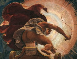 GLI ATTRIBUTI DEL SOLE – nella camera del Sole e della Luna c’è uno scorcio di Giulio Romano che fa vedere il carro della Luna che entra e quello del sole che sta uscendo. Il vento solleva le vesti dell’auriga “solare” mettendo in evidenza i gioielli di famiglia. Se fossimo stati a Roma alla Cappella Sistina un paio di braghe o di boxer moderni sarebbero stati inevitabili ma a Palazzo Te no!