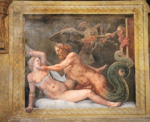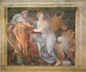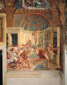 PASIFAE E LA VACCA DI LEGNO – nella camera di Amore e Psiche in realtà non è tanto la rappresentazione ad essere oscena ma il fatto che si intuisca cosa avverrà poi: è l’origine del Minotauro. Sulla parete di fronte all’ingresso in alto a destra Giulio rappresenta Pasifae, moglie di Minosse, mentre sta entrando nella vacca di legno costruitale da Dedalo per accoppiarsi con il toro di Poseidone. Dall’unione nascerà il minotauro, mito che sarà richiamato da Paolo Pozzo quando nel ‘700 progettò il pavimento della sala decorato con il motivo dei labirinti.