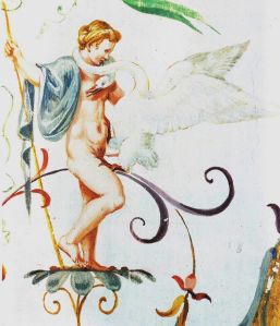 LEDA E IL CIGNO – nel camerino delle grottesche che si trova all’uscita del camarone dei giganti sulla sinistra occorre guardare bene nelle decorazioni delle vele della volta. Con la porta alle spalle bisogna guardare sulla parete di fronte, in alto a destra. Qui poco sopra la cornice c’è il piccolo particolare di una Leda con il cigno. Il volatile è avvinghiato alla ragazza in piedi e si scorge chiaramente il suo membro virile in posizione strategica. Il cigno è Giove e dalla sua unione con Leda nasceranno due uova. Quando si schiuderanno verranno alla luce due coppie di gemelli: Castore e Polluce ed Elena e Clitennestra.