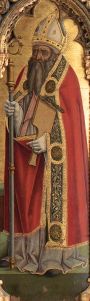 Vediamo il santo nell’immagine a corredo dell’articolo nelle vesti di vescovo e con il pettine in mano. L’opera è parte di un polittico che si trova nelle Marche a Monte San Martino ed è opera di Carlo e Vittore Crivelli (trovate l’immagine qui dal sito della Fondazione Zeri).