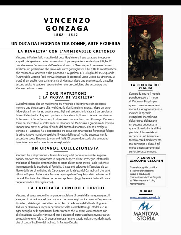 Vincenzo è un predestinato: è l’unico figlio maschio di Guglielmo Gonzaga e sarà l’erede al ducato di Mantova. E’ un duca da leggenda tra donne, arte e guerra e unico per la sua incapacità di darsi un limite. In trent’anni esaurirà il tesoro lasciatogli dal padre e potremmo utilizzare per lui (con qualche modifica) quello che avrebbe detto secoli dopo il calciatore George Best: “Ho speso gran parte dei miei soldi per donne, cavalli, guerre e opere d’arte. Il resto l’ho sperperato”.