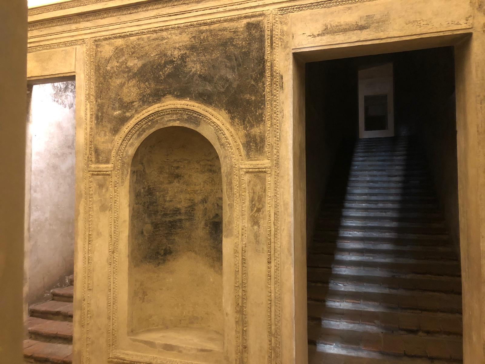 Sulla destra c’è l’imbocco di una scaletta che ci conduce in ambienti di regola chiusi alla visita e che si trovano nei pressi della Cappelletta dell’appartamento del Duca. E’ un percorso quello che stiamo facendo che ci racconta l’evoluzione del Palazzo Ducale per successive sovrapposizioni come se fosse un palinsesto, una pergamena continuamente raschiata e riscritta. E ora arriviamo all’ultima scala che prendiamo in considerazione in questo articolo rimandando le altre ad una prossima puntata.