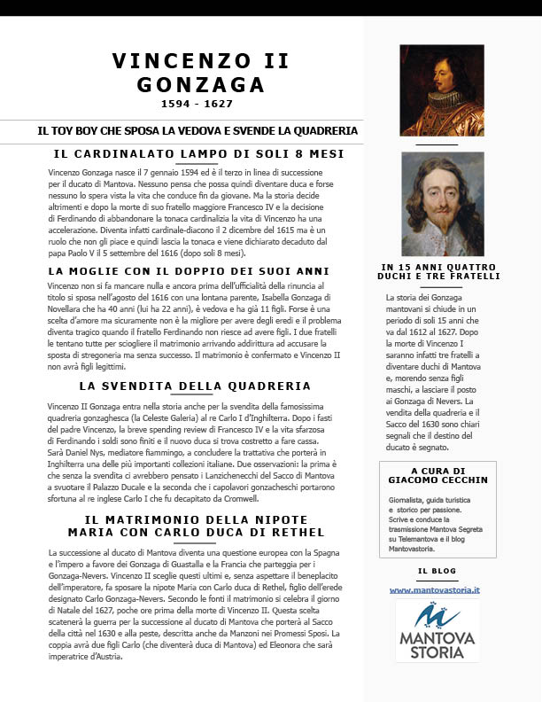 cardinale Vincenzo Gonzaga, Carlo I d'Inghilterra, Daniel Nys, duca Vincenzo II Gonzaga, I Gonzaga, il toy boy della dinastia Gonzaga, Isabella Gonzaga di Novellara, la svendita della quadreria, Oliver Cromwell, processo per stregoneria, Vincenzo II Gonzaga