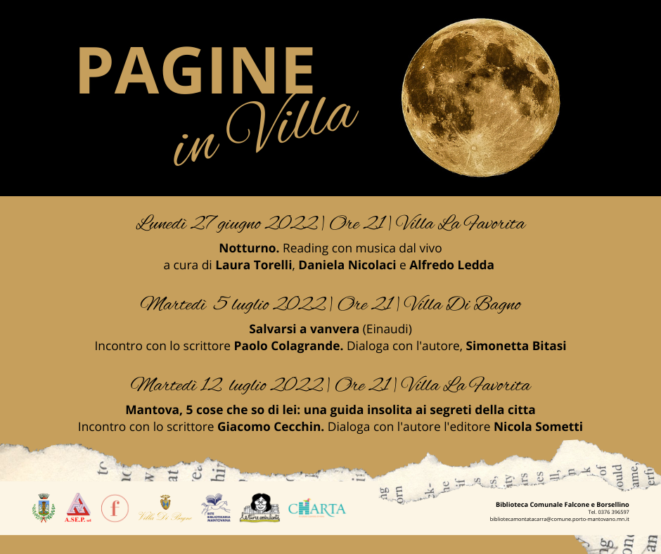 La presentazione è inserita nella manifestazione PAGINE IN VILLA, rassegna estiva di incontri letterari promossi dall’Assessorato alla Cultura e dalla Biblioteca Comunale di Porto Mantovano nelle meravigliose cornici di Villa La Favorita e Villa Di Bagno.