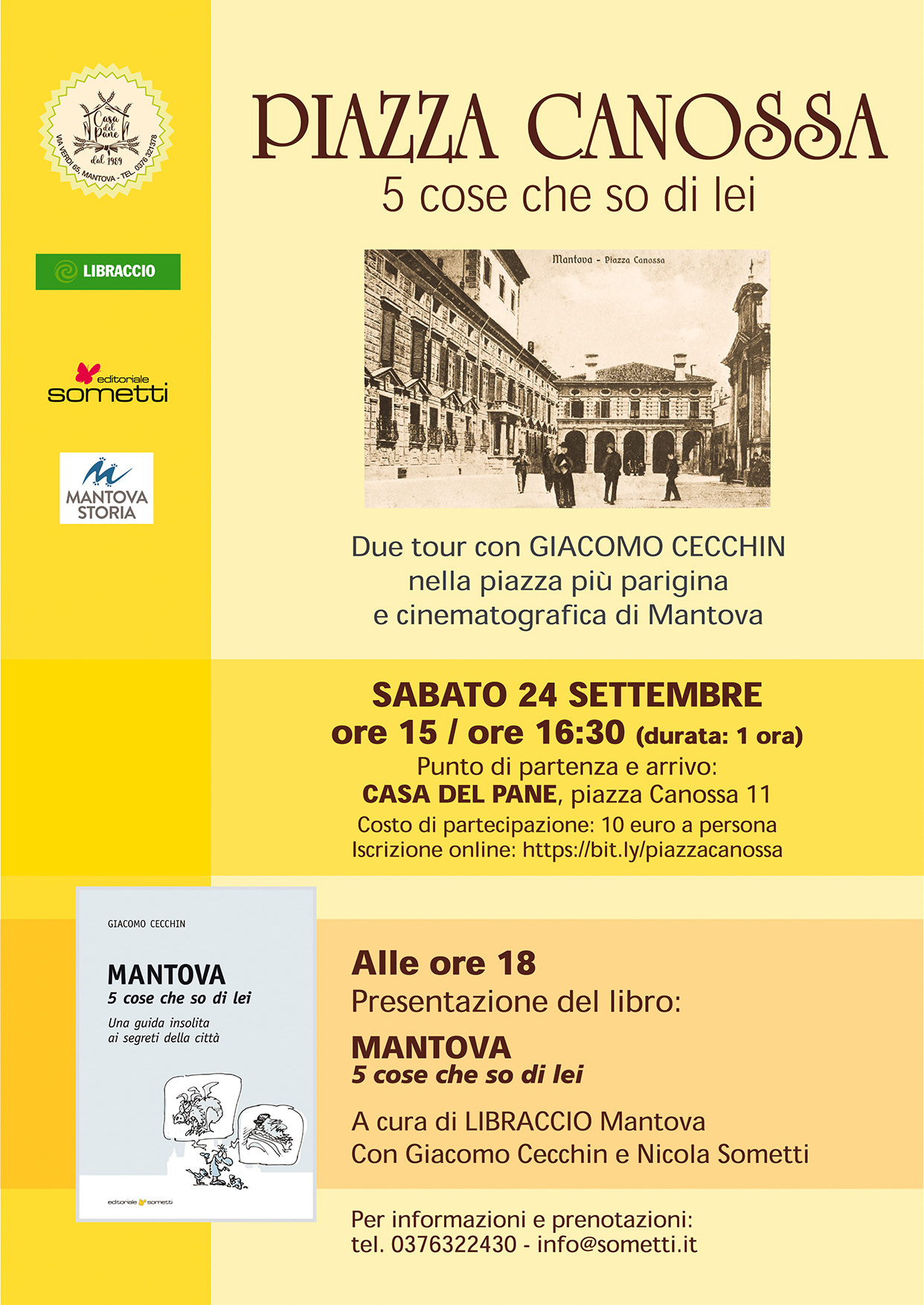 Era tempo che volevo presentare il mio libro in Piazza Canossa a pochi metri dalla casa editrice SOMETTI che lo ha pubblicato. Allora ho pensato non solo di raccontare “Mantova, 5 cose che so di lei” ma anche di farvi vedere la piazza attraverso una cinquina dedicata a questo piccolo gioiello. Eccovi il programma.