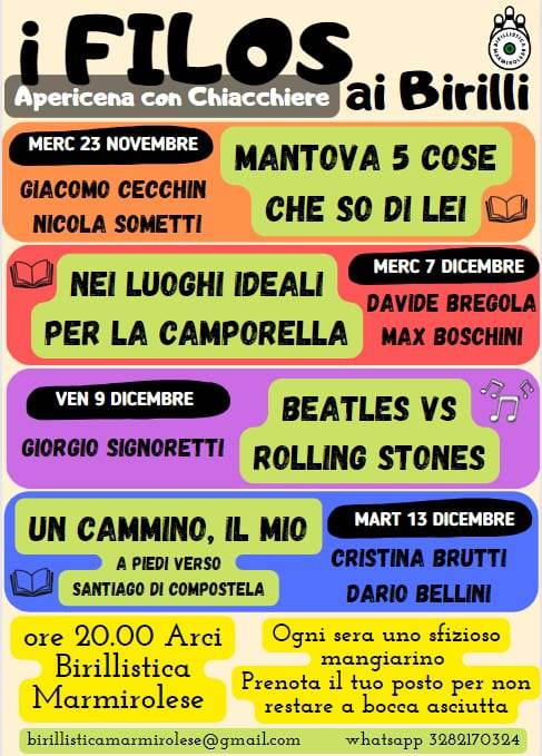 Come ci si riuniva una volta nelle barchesse e nelle stalle a far filos, questi i 4 incontri all’Arci Birillistica Marmirolese vogliono unire parola e cibo, in serate in cui ci si vorrebbe dimenticare del tempo. Tutte le iniziative si svolgeranno a partire dalle ore 20 presso l’Arci Birillistica Marmirolese in via G.DiVittorio, 8 (vicino all’area Feste posta dietro il supermercato Rossetto)