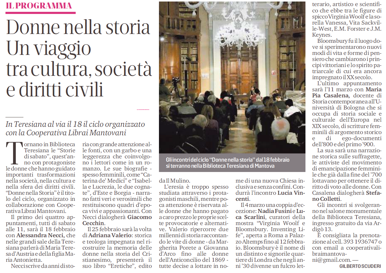 L’ultimo appuntamento sarà l’11 marzo con Maria Pia Casalena, docente di Storia contemporanea all’Università di Bologna che si occupa di storia sociale e culturale dell’Europa nel XIX secolo, di scritture femminili di argomento storico e di ego-documenti dell’800 e del primo ’900. La sua sarà una narrazione storica sulle suffragette, le attiviste del movimento di emancipazione femminile che già dalla fine del ’700 lottavano per ottenere il diritto di voto alle donne. Con Casalena dialogherà Stefano Colletti. Gli incontri si svolgeranno nel salone monumentale della Biblioteca Teresiana, ingresso gratuito da via Ardigò 13. È consigliata la prenotazione al cell. 393 1936747 o con email a cooperativalibraimantovani@gmail.com