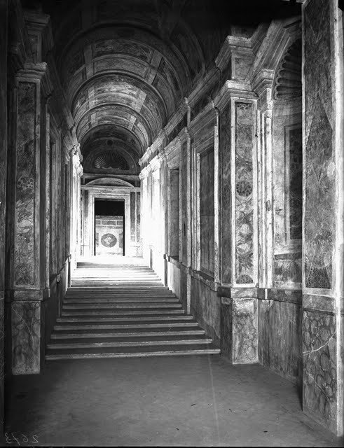 Partiamo dal corridoio dei Mori e scendiamo dalla scala che si apre proprio in corrispondenza della Galleria degli Specchi. Si tratta di una scala tripartita che consente di arrivare nei due corridoi che circondano piazza Santa Barbara e che conducono a sinistra verso il castello e a destra verso l’appartamento delle Metamorfosi.