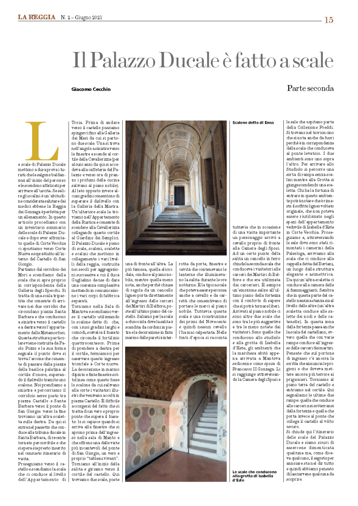 “Palazzo Ducale è fatto a scale” sembra una filastrocca ma è proprio così. Ce ne sono decine: scale, scalette, scaloni e se le stanze della reggia dei Gonzaga sono più di 1.000 chi lo sa quanti sono gli scalini. E’ il secondo articolo dedicato alle scale di Palazzo Ducale e soprattutto a quelle che si trovano in Corte Nuova e nel Castello di San Giorgio. Chi volesse sfogliare tutta la rivista in cui è inserito l’articolo può cliccare a questo link: https://www.societapalazzoducalemantova.com/wp-content/uploads/2021/11/La-Reggia-Giugno-2021.pdf