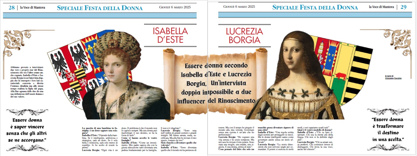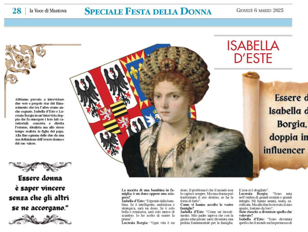 Ho provato a intervistare due vere e proprie star del Rinascimento che tra l’altro erano anche cognate. Isabella d’Este e Lucrezia Borgia in un’intervista doppia che fa emergere i loro lati caratteriali: concreta e diretta l’estense, idealista ma allo stesso tempo realista la figlia del papa. Alla fine ognuna delle due da una sua definizione dell’essere donna e del suo valore.