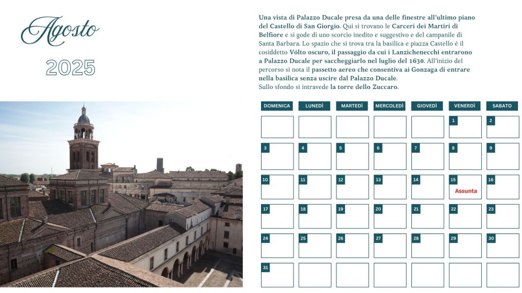 Agosto 2025, Calendario, calendario 2025, Campanile di santa barbara, Castello di San Giorgio, Giacomo Cecchin, Giovanna Caleffi, Mantovastoria, Palazzo Ducale, Palazzo ducale di Mantova