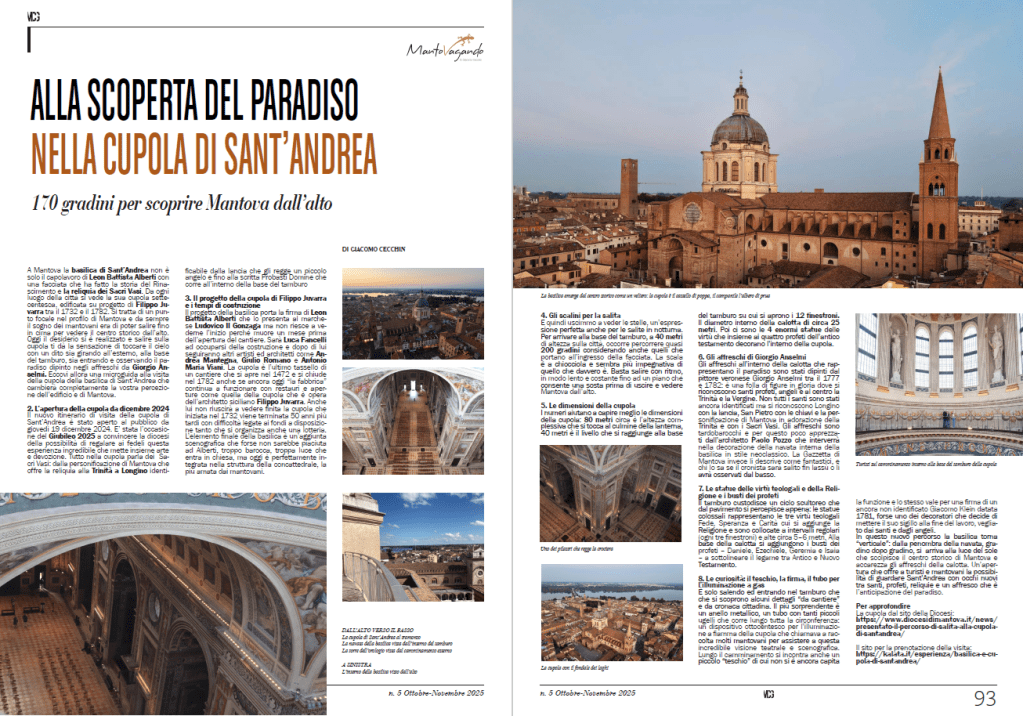 E’ un’occasione da non perdere quella di salire sulla cupola di Sant’Andrea per almeno due motivi: in una città di pianura come Mantova basta salire di poco per avere una vista spettacolare sulla città e sui dintorni. In secondo luogo all’interno della cupola si ha la sensazione di toccare il paradiso con un dito potendo osservare da vicino gli affreschi di Giorgio Anselmi. Ecco alcuni dettagli per prepararsi alla visita che che ho sintetizzato in questa doppia pagina pubblicata su MCG – Mantova Chiama Garda.