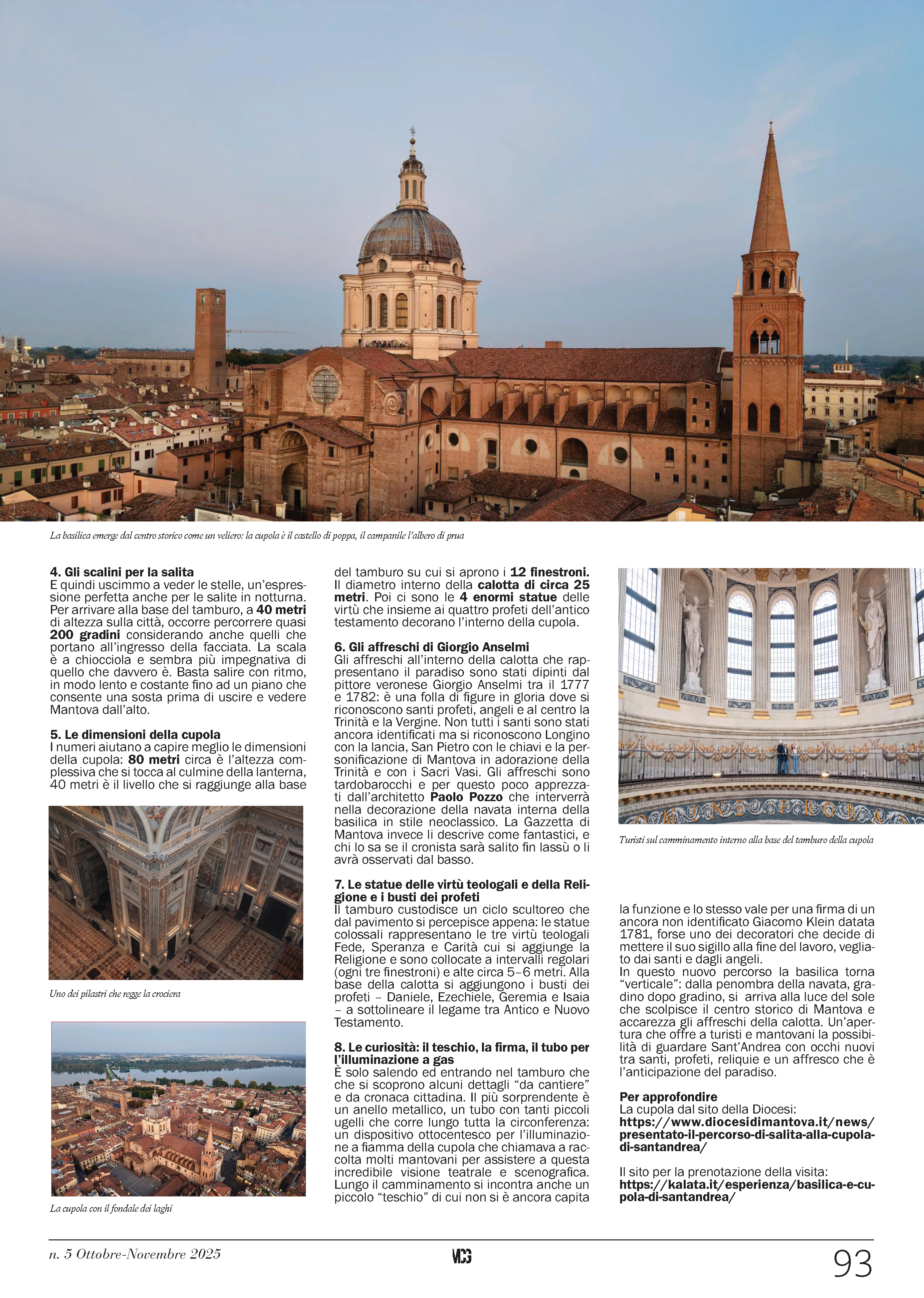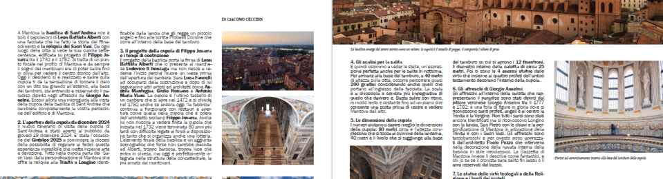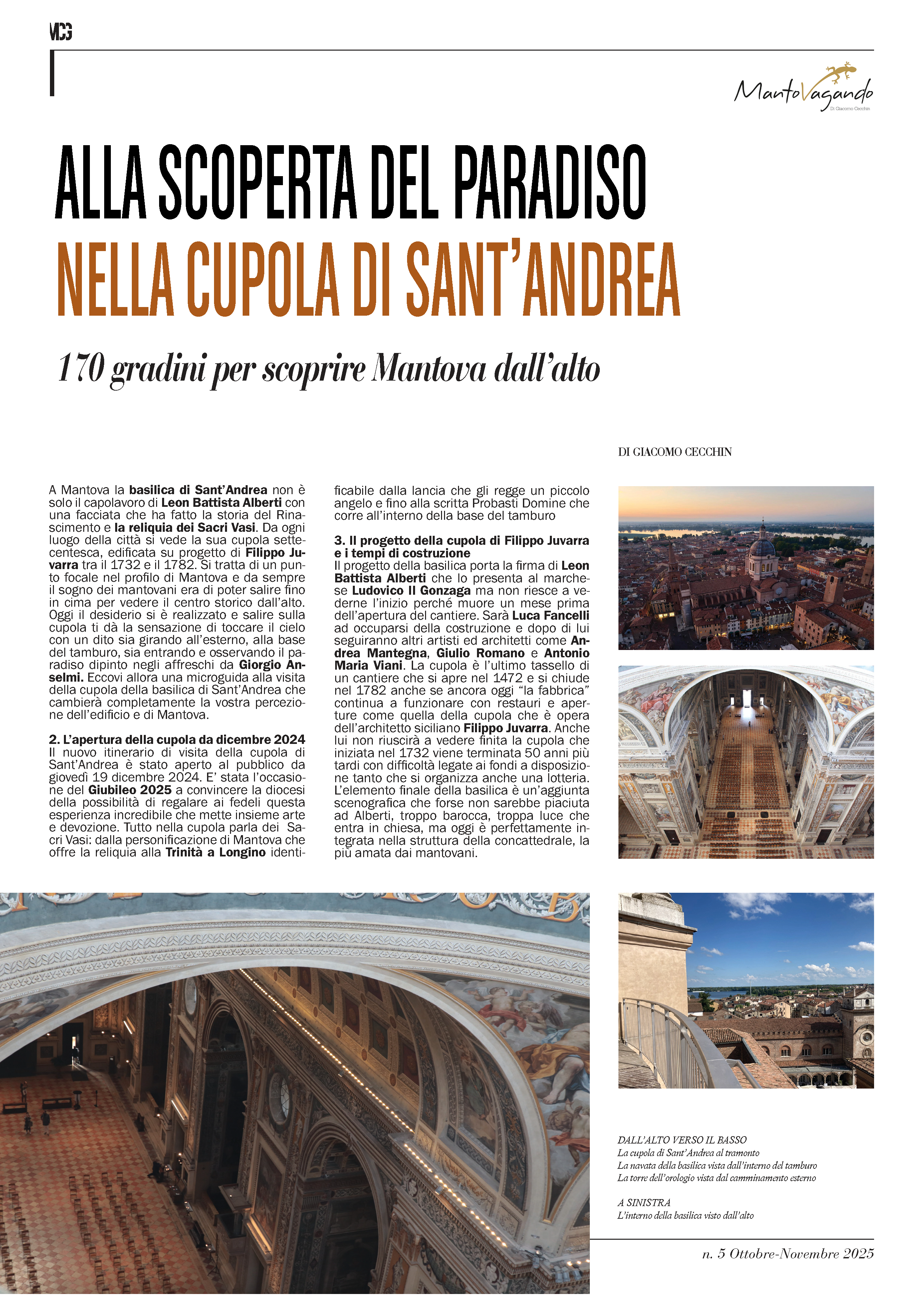 E’ un’occasione da non perdere quella di salire sulla cupola di Sant’Andrea per almeno due motivi: in una città di pianura come Mantova basta salire di poco per avere una vista spettacolare sulla città e sui dintorni. In secondo luogo all’interno della cupola si ha la sensazione di toccare il paradiso con un dito potendo osservare da vicino gli affreschi di Giorgio Anselmi. Ecco alcuni dettagli per prepararsi alla visita che che ho sintetizzato in questa doppia pagina pubblicata su MCG – Mantova Chiama Garda.