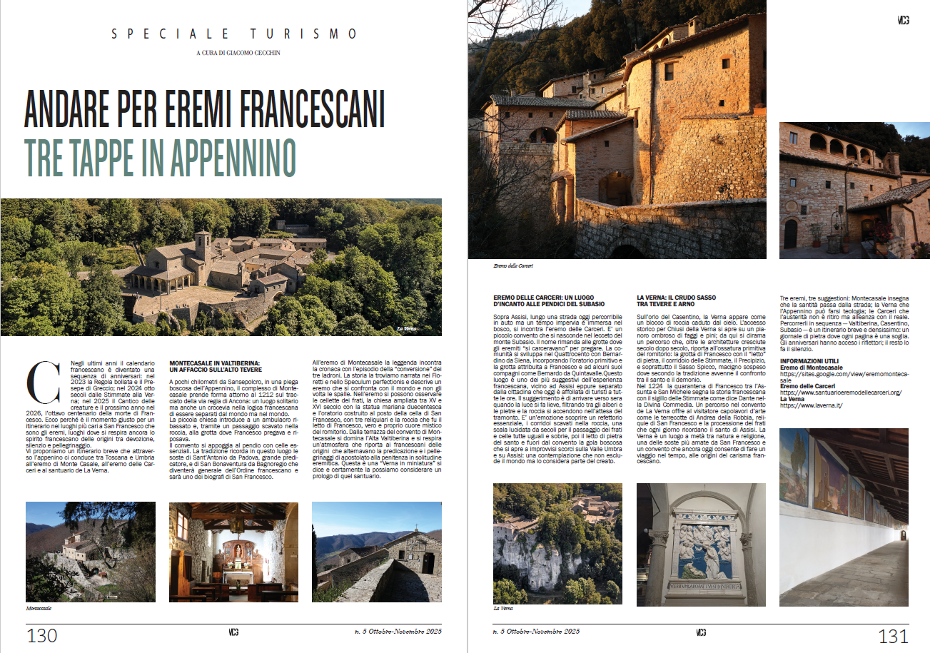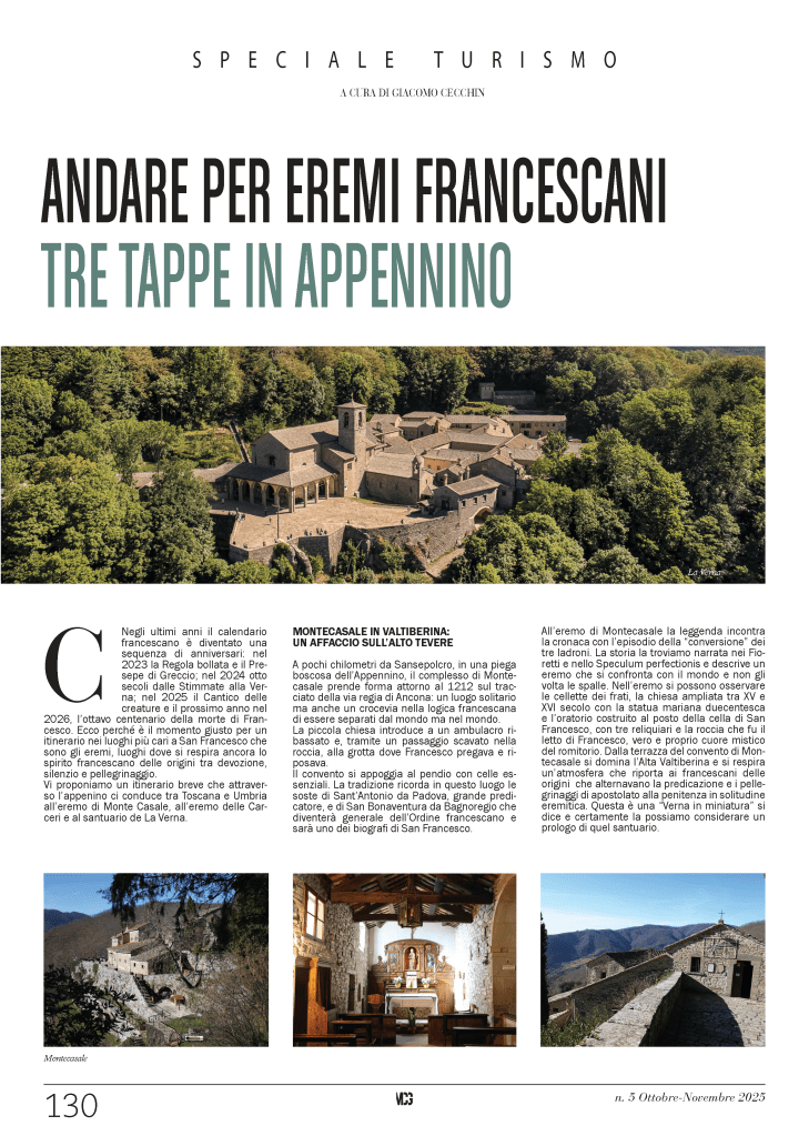 This article proposes a concise yet meaningful itinerary through three key Franciscan hermitages in the Apennines: Montecasale in the Valtiberina, the Eremo delle Carceri near Assisi, and the Sanctuary of La Verna. Set against the backdrop of important Franciscan anniversaries, the journey explores places where solitude, prayer, and contact with the world coexist. Each site reveals a different aspect of Franciscan spirituality: Montecasale as a place where sanctity meets everyday life, the Carceri as an alliance between austerity and creation, and La Verna as a dramatic landscape where theology, nature, and history converge. Moving between Tuscany and Umbria, this itinerary offers a spiritual and cultural experience rooted in silence, pilgrimage, and the enduring legacy of Saint Francis.