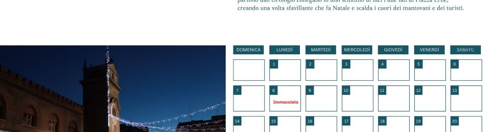 Le luci natalizie trasformano la vista di Piazza Erbe e del Palazzo della Ragione. La piazza da cartolina di Mantova diventa uno sfolgorio di luci che descrivono l’architettura degli edifici medioevali. I portici che alloggiavano magazzini e botteghe e la torre dell’orologio, inserto rinascimentale all’interno del palazzo medioevale dove si amministrava la giustizia. Poco oltre si intravede la mole della Rotonda di San Lorenzo, la chiesa più amata dai mantovani e pù visitata dai turisti. I fili luminosi che partono dall’Orologio collegano in uno scintillio di luci i due lati di Piazza Erbe, creando una volta sfavillante che fa Natale e scalda i cuori dei mantovani e dei turisti.