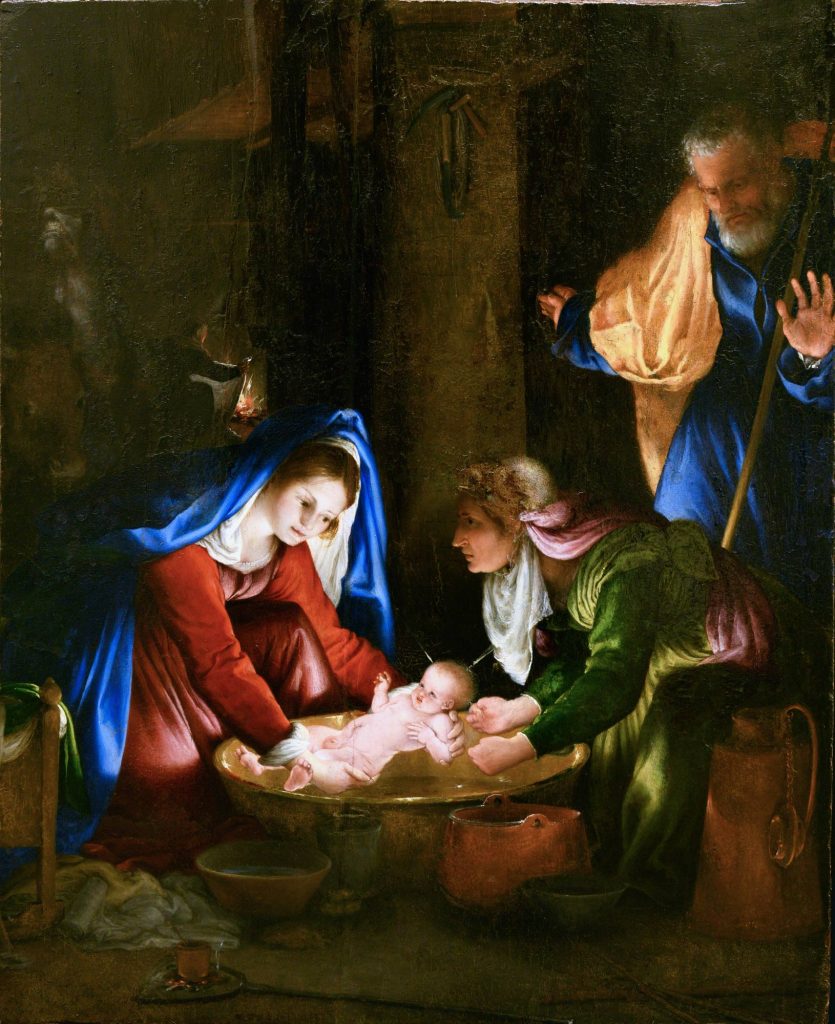 Quella dipinta da Lotto nel 1525 non è una Natività nel senso consueto del termine. L’artista sceglie di rappresentare un episodio raro, ispirato ai Vangeli apocrifi: il primo bagno di Gesù bambino. Maria è chinata sulla tinozza, concentrata in un gesto di cura quotidiana; il neonato si ritrae dall’acqua fredda con un movimento naturale, quasi improvviso. Accanto a loro compare una figura insolita, un’anziana levatrice, assente nei Vangeli canonici ma centrale nella scena.
