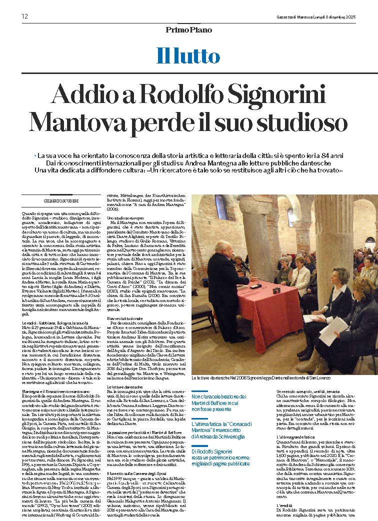 Quando si spegne una vita come quella di Rodolfo Signorini – studioso, divulgatore, insegnante, accademico, indagatore di ogni aspetto dell’identità mantovana – non si perde soltanto un uomo di cultura, ma un modo di guardare il passato, di leggerlo, di raccontarlo.