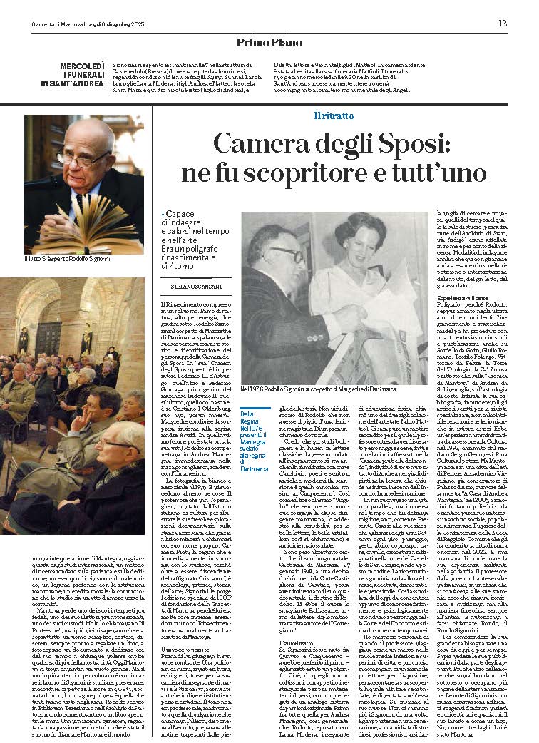 Signorini era anche socio onorario della Società di Palazzo Ducale. «Era uno studioso eccezionale – ricorda Stefano L’Occaso, direttore della reggia gonzaghesca –. I suoi approfondimenti sulla Camera degli Sposi, sulle Metamorfosi e sui molteplici aspetti culturali di Mantova hanno segnato gli studi degli ultimi decenni. La lettura della Camera degli Sposi che oggi proponiamo al pubblico è quella da lui elaborata».