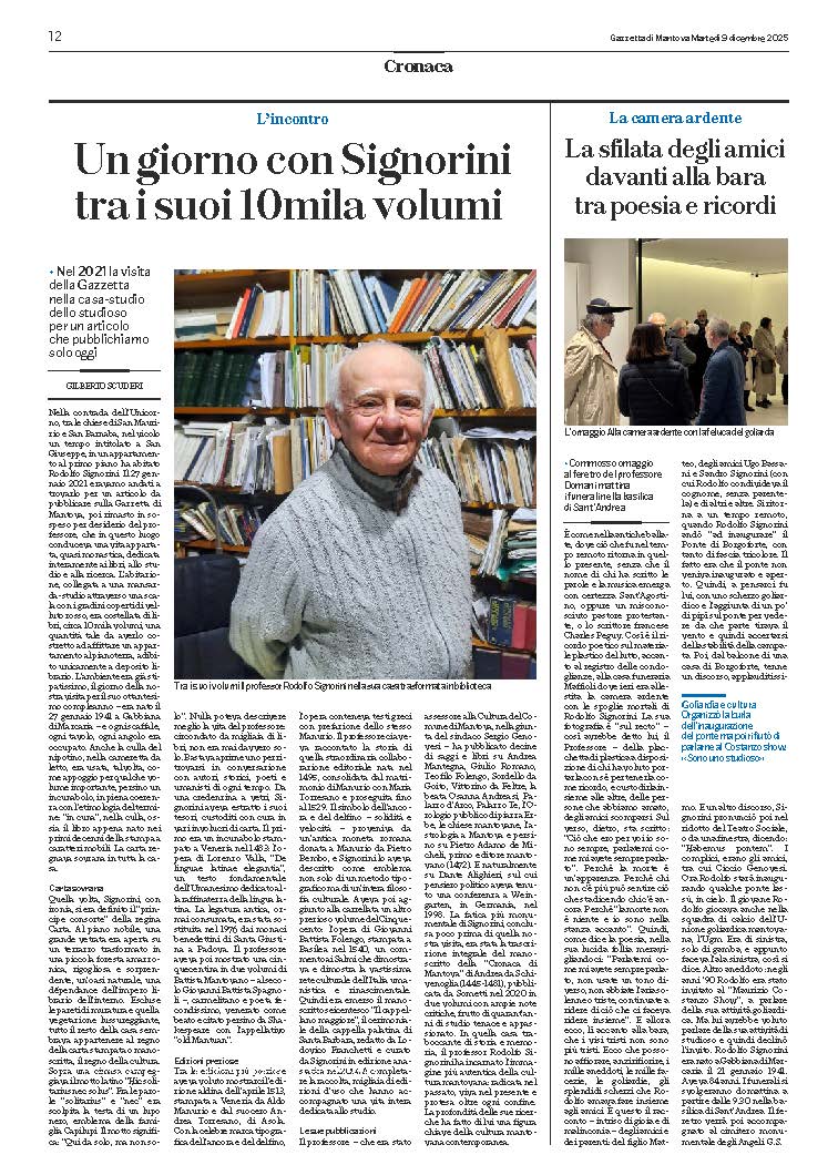 Oggi Mantova si trova davanti a un vuoto grande. Ma il modo più autentico per colmarlo è continuare il lavoro di Signorini: studiare, preservare, raccontare, rispettare. E forse, in questa giornata di lutto, l’immagine più vera è quella che tanti hanno visto negli anni: Rodolfo seduto in Biblioteca Teresiana o all’Archivio di Stato, con un documento antico o un libro aperto tra le mani.