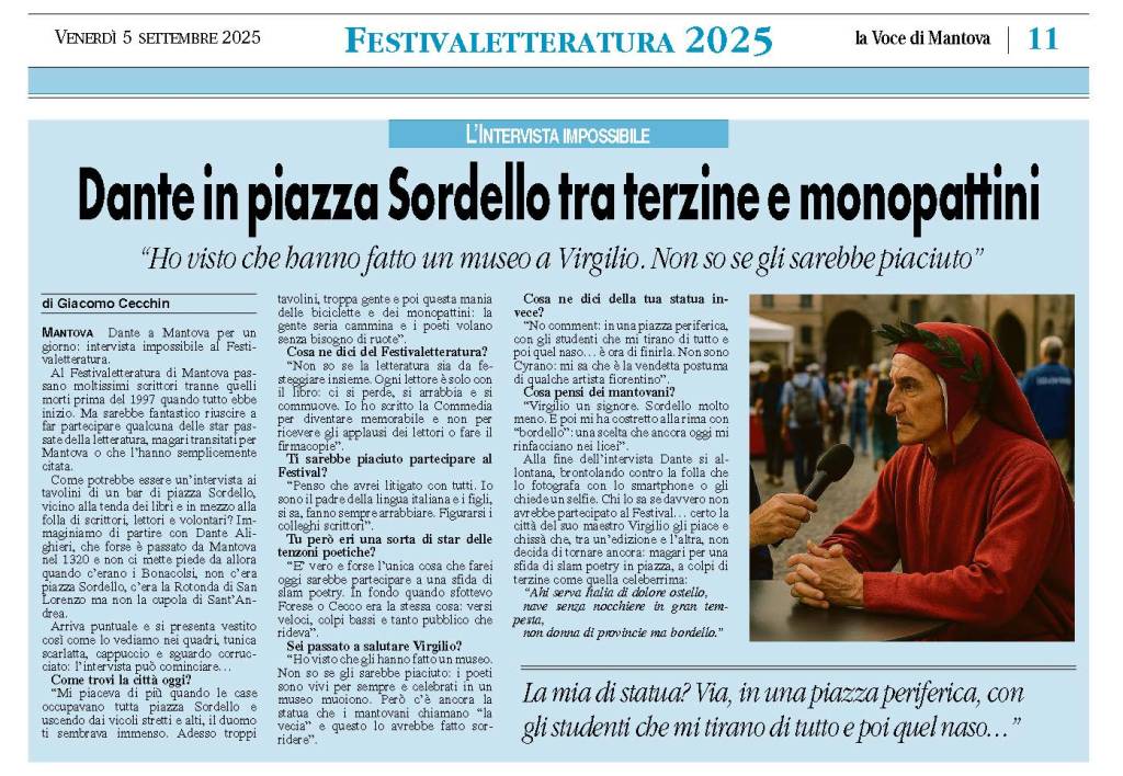 D’altra parte la la letteratura è vita e la vita è un gioco e allora forse giocare facendo dell’ironia è una delle cose più belle che ci sia. Di seguito trovate il testo integrale dell’intervista pubblicata su La Voce di Mantova di venerdì 5 settembre 2025 a pagina 11 .