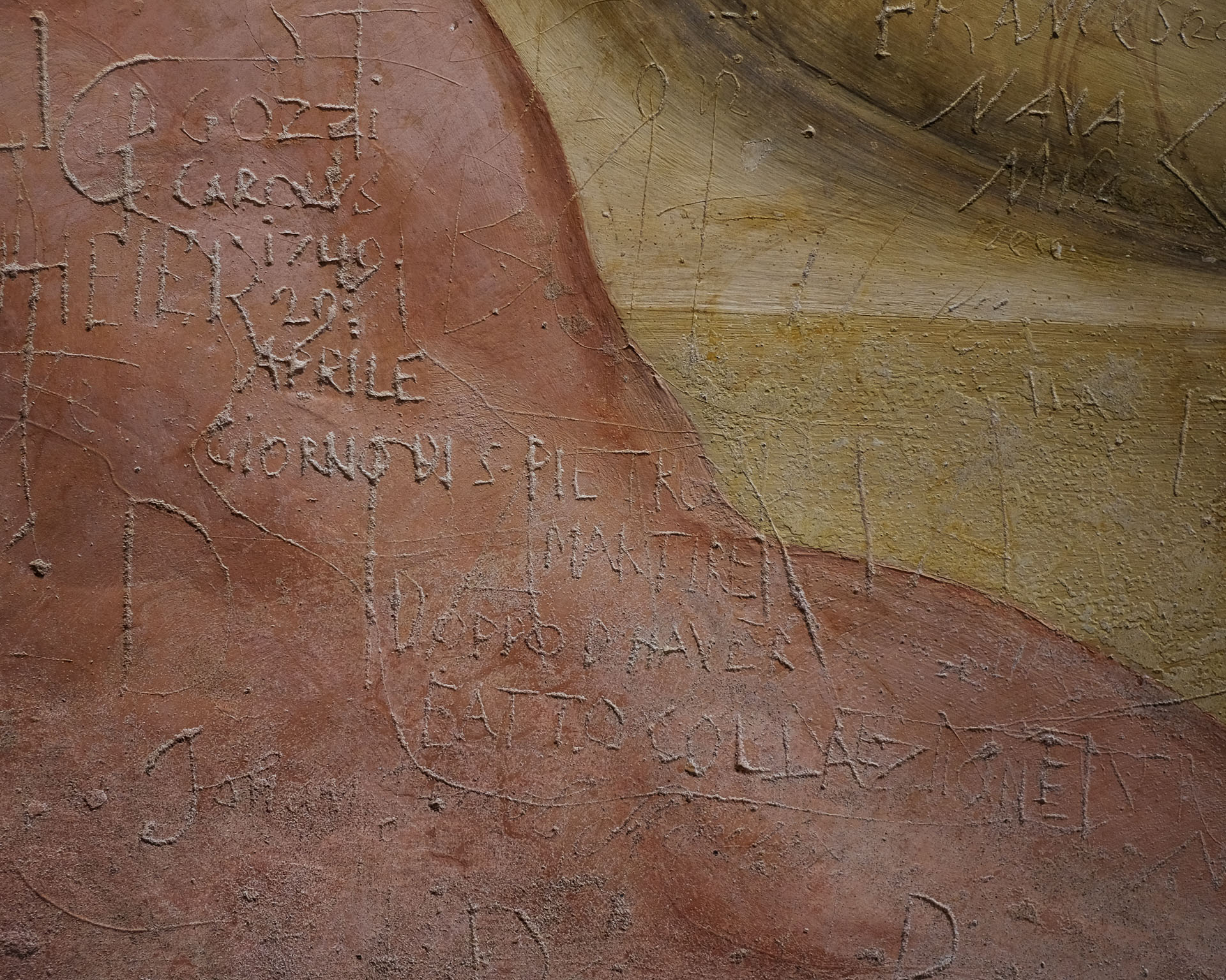 Durante il restauro, la scelta — a mio parere corretta — è stata quella di non stuccare le scritte, ma di riempirne i solchi con il colore. In questo modo si preserva la leggibilità degli affreschi senza cancellare del tutto le tracce di una “storia minore” che ormai fa parte integrante delle vicende di Palazzo Te.