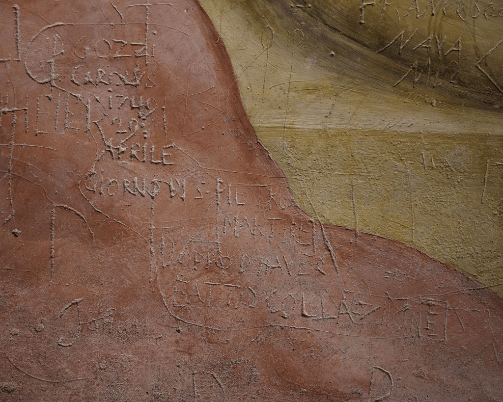 Nel caso romano, le scritte hanno un valore del tutto particolare. Riportano infatti i nomi di celebri pittori del Quattrocento che, calandosi letteralmente “in grotta” per esplorare gli ambienti sotterranei della Domus Aurea, rimasero affascinati dalle pitture romane del I secolo d.C.