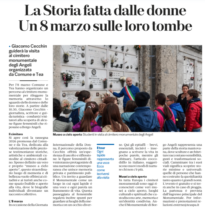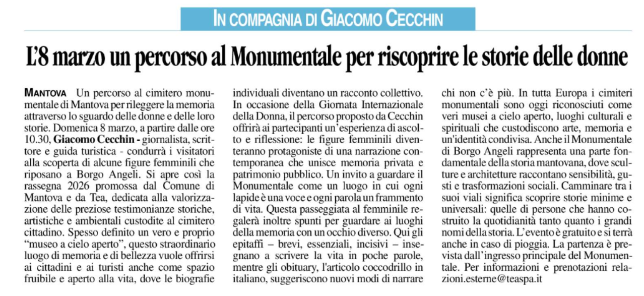 Per l’8 marzo Comune e Tea hanno organizzato un percorso al cimitero monumentale per rileggere la memoria attraverso lo sguardo delle donne e delle loro storie. A partire dalle 10.30, Giacomo Cecchin – giornalista, scrittore e guida turistica – condurrà i visitatori alla scoperta di alcune figure femminili che riposano a Borgo Angeli.Il cimiteroSi apre così la rassegna 2026 promossa dal Comune e da Tea, dedicata alla valorizzazione delle preziose testimonianze storiche, artistiche e ambientali custodite al cimitero cittadino. Spesso definito un vero e proprio “museo a cielo aperto”, questo straordinario luogo di memoria e di bellezza vuole offrirsi ai cittadini e ai turisti anche come spazio fruibile e aperto alla vita, dove le biografie individuali diventano un racconto collettivo.L’8 marzoIn occasione della Giornata Internazionale della Donna, il percorso proposto da Cecchin offrirà un’esperienza di ascolto e riflessione: le figure femminili diventeranno protagoniste di una narrazione contemporanea che unisce memoria privata e patrimonio pubblico. Un invito a guardare il Monumentale come un luogo in cui ogni lapide è una voce e ogni parola un frammento di vita. Questa passeggiata al femminile regalerà inoltre spunti per guardare ai luoghi della memoria con un occhio diverso. Qui gli epitaffi – brevi, essenziali, incisivi – insegnano a scrivere la vita in poche parole, mentre gli obituary, l’articolo coccodrillo in italiano, suggeriscono nuovi modi di narrare chi non c’è più.Musei a cielo apertoIn tutta Europa i cimiteri monumentali sono oggi riconosciuti come veri musei a cielo aperto, luoghi culturali e spirituali che custodiscono arte, memoria e un’identità condivisa. Anche il Monumentale di Borgo Angeli rappresenta una parte della storia mantovana, dove sculture e architetture raccontano sensibilità, gusti e trasformazioni sociali. Camminare tra i suoi viali significa scoprire storie minime e universali: quelle di persone che hanno costruito la quotidianità tanto quanto i grandi nomi. L’evento è gratuito e si terrà anche in caso di pioggia. La partenza è prevista dall’ingresso principale del Monumentale. Per informazioni e prenotazioni relazioni.esterne@teaspa.it