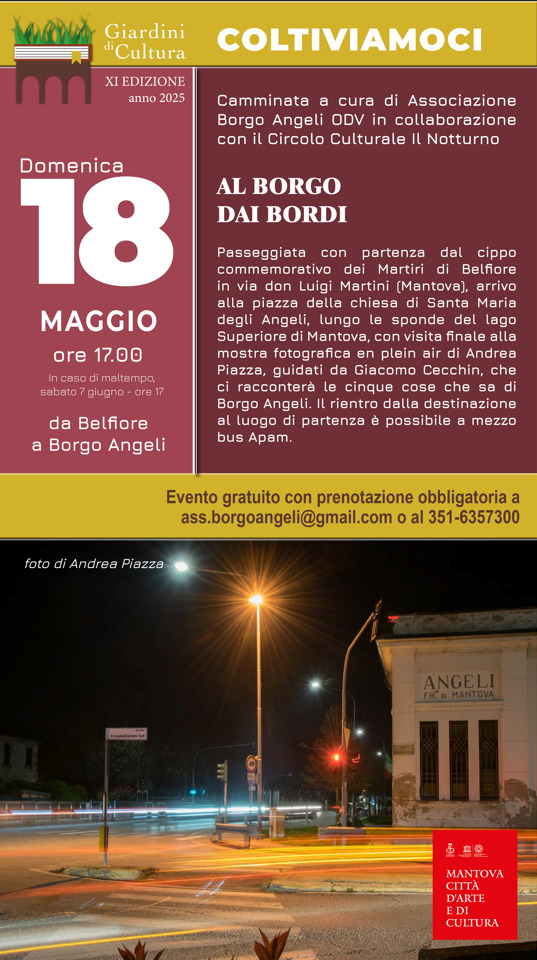 Anche quest’anno parteciperò all’iniziativa Giardini di Cultura 2025 grazie alla disponibilità dell’associazione Borgo Angeli ODV in collaborazione con il circolo culturale IL NOTTURNO con una passeggiata fino al borgo degli Angeli partendo dai bordi del Lago Superiore a Belfiore.