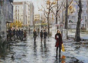 Il potere di un artista è quello di regalarci uno sguardo nuovo per vedere davvero i luoghi. Spesso infatti camminiamo per Mantova senza accorgerci della bellezza di alcuni scorci, soprattutto quando ci troviamo in quartieri nuovi come quello di Valletta Valsecchi. Provate a guardare questo quadro di Giancarlo Businelli e a dirmi se non vi sembra un’immagine parigina, con quel colpo di colore della borsa della ragazza in primo piano che si riflette sul bagnato e le foglie autunnali degli alberi che ci annunciano il cambio di stagione.