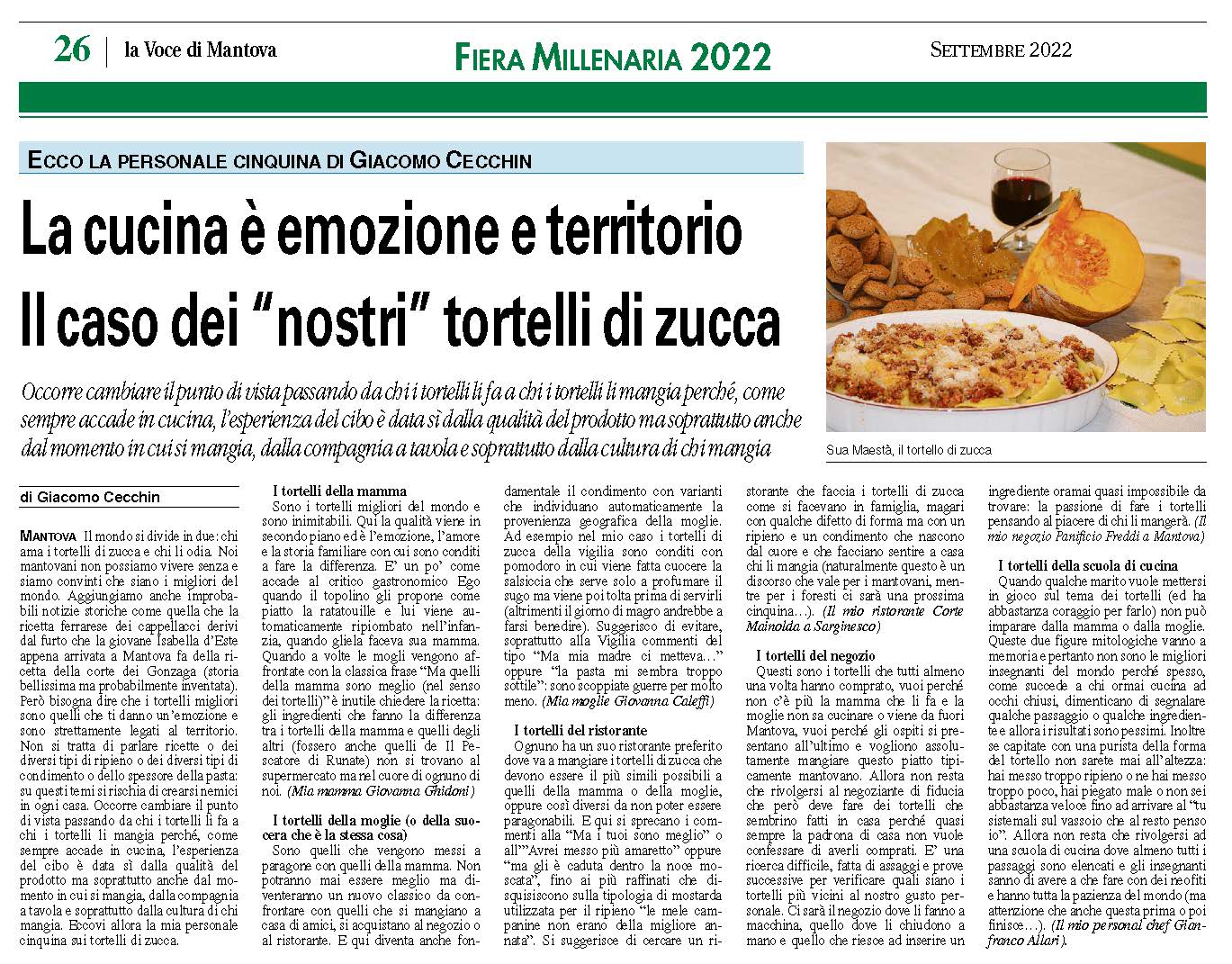 Per chi volesse partecipare questo è il sito della Millenaria https://www.fieramillenaria.it/millenaria-2022 . Qui invece un mio articolo sui Tortelli di Zucca pubblicato sullo Speciale Millenaria de La Voce di Mantova.