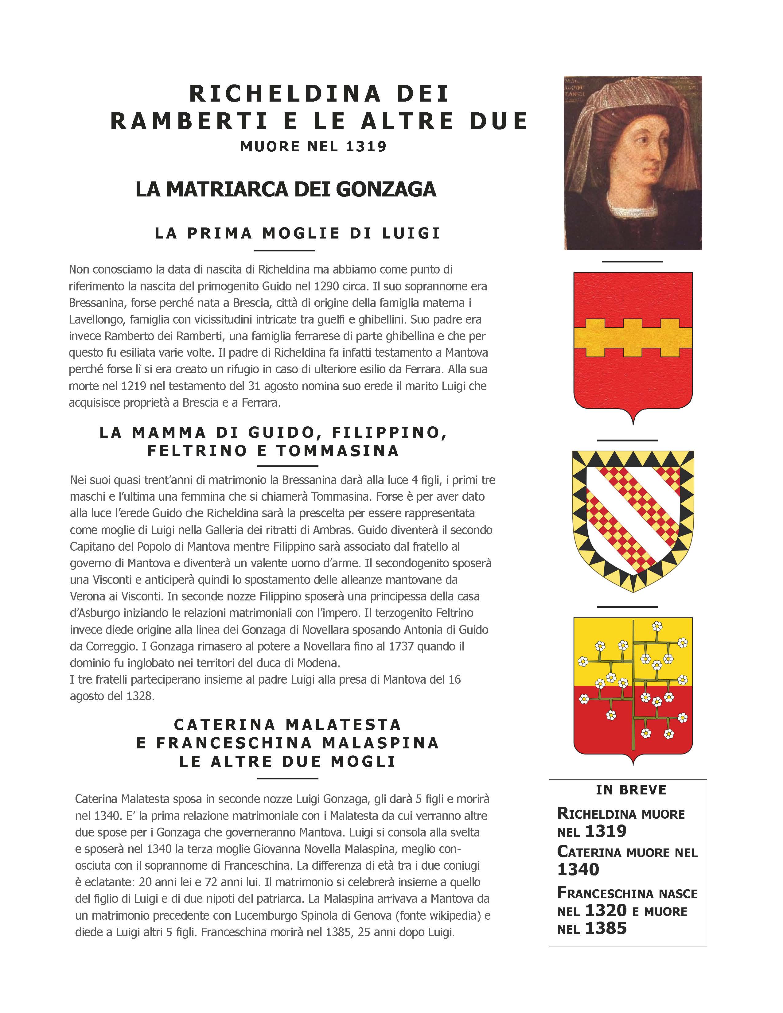 Per questo ho voluto raccontare anche le donne dei Gonzaga: dalle prime per cui abbiamo pochissime notizie sparse a quelle del rinascimento dove invece le informazioni sono molte di più. Partiamo con le prime tre moglie di Luigi Gonzaga. Una moglie per un personaggio come lui non può bastare. A Richeldina dei Ramberti detta la Bressanina seguono Caterina Malatesta e Franceschina Malaspina. Abbiamo poche notizie su di loro ma sappiamo che daranno ben 16 figli a Luigi e che il terzo matrimonio si svolgerà nello stesso anno della morte della seconda moglie: non perdiamo tempo avrà detto Luigi che aveva ben 50 anni in più della sposa.