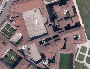 I cortili e le piazze descritte nell’articolo: 1 piazza Castello; 2 cortile di Castello; 3 Cortile dei Cani; 4 Cortile del Frambus; 5 Cortile delle 8 facce; 6. Vòlto oscuro. Il cortile di Santa Croce è fuori dall’immagine.