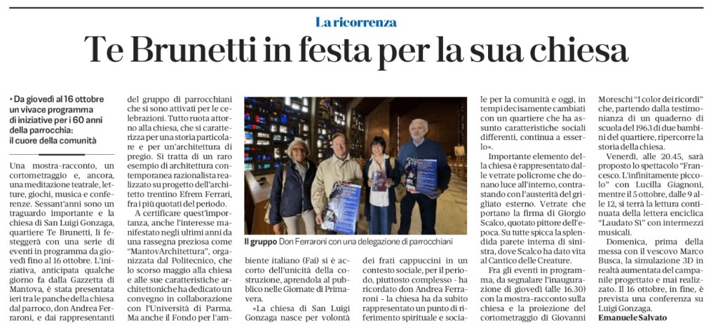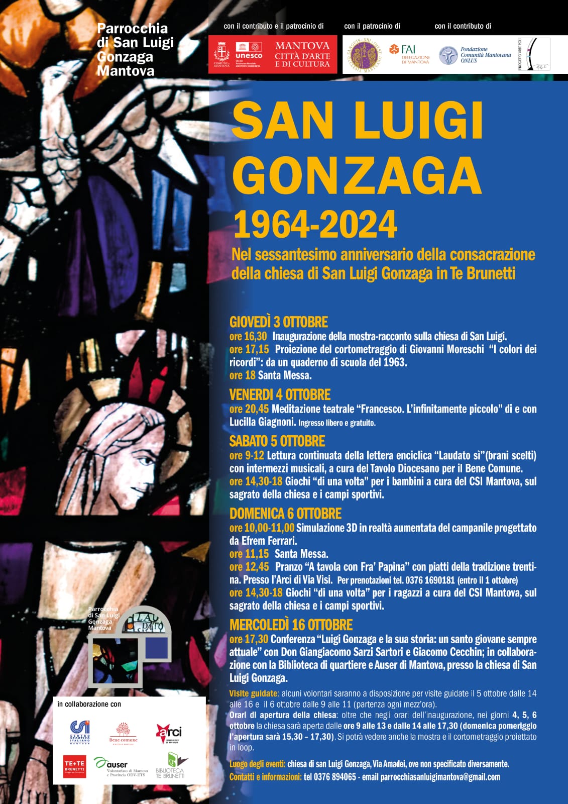 La conversazione è inserita nel programma di iniziative per i 60 anni della consacrazione della chiesa di San Luigi in Te Brunetti a Mantova. Si tratta di una serie di conferenze, spettacoli e tanto altro per valorizzare la storia di San Luigi e del quartiere di Te Brunetti. Ecco il programma completo: