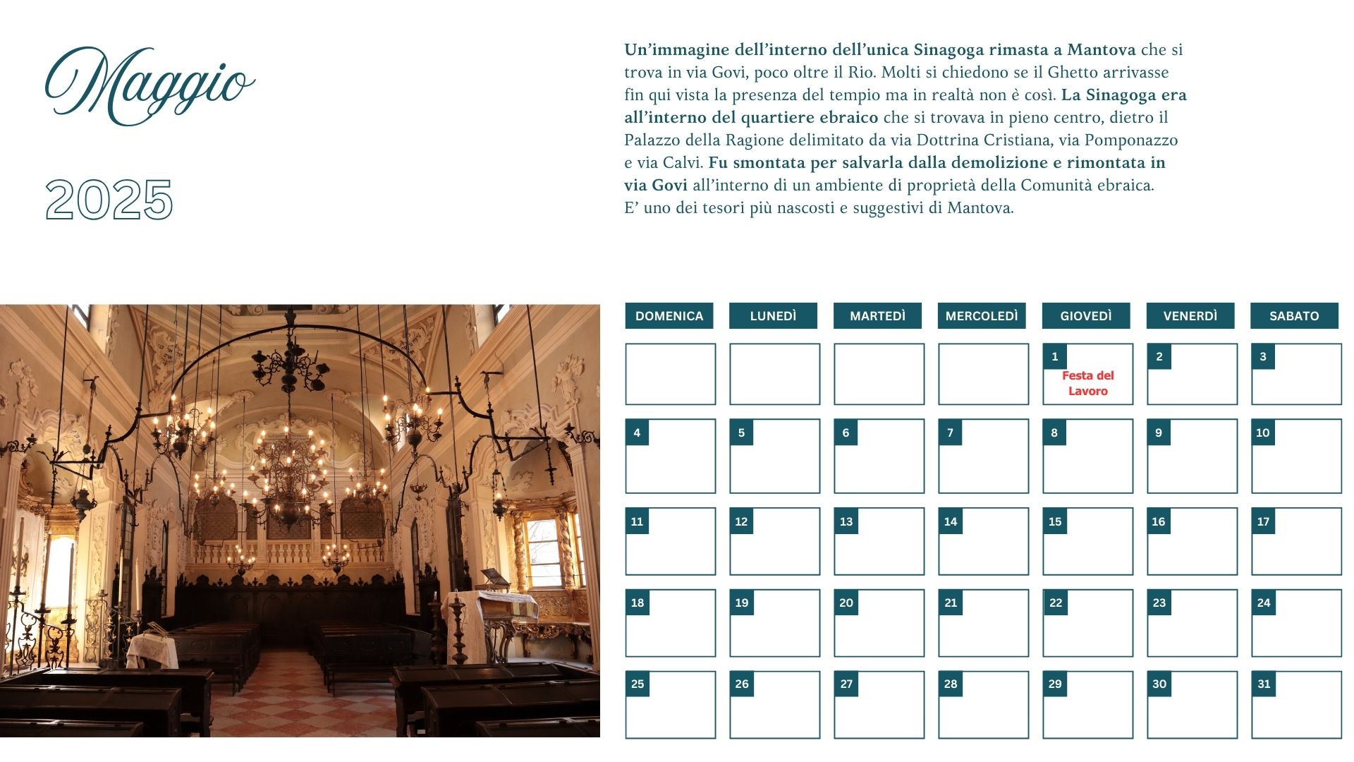 Calendario, calendario 2025, Giacomo Cecchin, Giovanna Caleffi, maggio 2025, Mantovastoria, Sinagoga, Sinagoga di Mantova